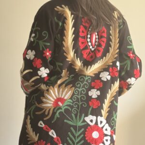 Porte-le sur une tenue monochrome (total look noir ou beige) pour un contraste fort qui met en avant la broderie. Ajoute des escarpins ou des sandales fines pour un look sophistiqué.